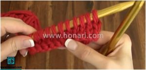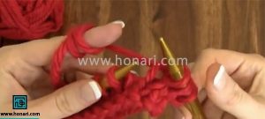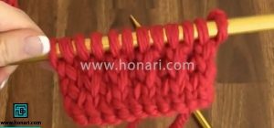 ردۀ چهارم را تمام دانهها را از رو میبافیم. برای ردۀ پنجم، دقیقاً مانند ردۀ سوم عمل میکنیم؛ یعنی یک دانه از زیر بافته و دانهٔ بعدی را بدون بافتن رد میکنیم. این روش را به همین شکل ادامه میدهیم: تمام ردههای فرد (مثل یک، سه، پنج و…) را مانند ردۀ سوم میبافیم و تمام ردههای زوج (مثل دو، چهار، شش و…) را همگی از رو میبافیم. در پایان، طرح بافت به شکلی که در تصویر مشاهده میکنید درخواهد آمد.