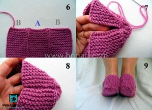 ردیف‌های ۶۴ تا ۷۲: دانه‌ها را بدون تغییر باقی می‌گذاریم. سپس کاموا را از داخل آن‌ها عبور داده و جمع می‌کنید. بعد، به اندازه‌ای که می‌خواهید روی پای شما بسته شود، آن را می‌دوزیم.