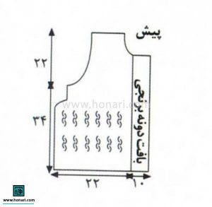 قسمت جلوی لباس نیز به همین روش بافته می‌شود و در بخش بالایی آن، سه جای دکمه دوتایی ایجاد می‌کنیم.