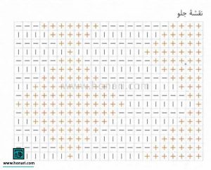 با نخ طوسی سوپرلانا میدی، ۴۸ دانه سر بیندازید و ۵ سانتی‌متر بافت جودانه انجام دهید. سپس با نخ طوسی روشن، ۱۲ دانه جودانه ببافید، بعد ۲۱ دانه را مطابق نقشه پیش ببرید و ۱۵ دانه باقی‌مانده را با نخ طوسی ساده ببافید.