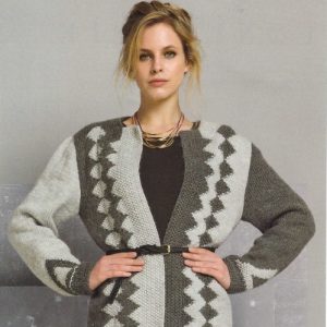 برای بخش جلوی سمت چپ ژاکت، رنگ‌ها را جابه‌جا ببافید؛ یعنی قسمت‌های طوسی را با نخ طوسی روشن و قسمت‌های طوسی روشن را با نخ طوسی ساده کار کنید.