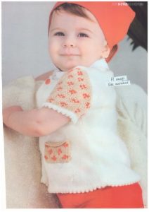 سپس برای قسمت حلقه آستین، به ترتیب ۱، ۲ و ۳ دانه کم می‌کنیم. وقتی قد این قسمت به ۶ سانتی‌متر رسید، برای فرم دادن به یقه، به ترتیب ۱، ۱، ۱، ۳، ۴ و ۵ دانه کم می‌کنیم. وقتی قد قسمت یقه به ۱۲ سانتی‌متر رسید، همه دانه‌ها را با هم در یک مرحله از کار خارج کرده و می‌بندیم.