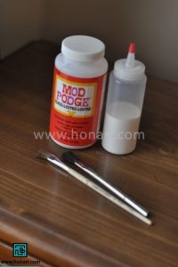 با استفاده از یک قلمو، یک لایه چسب دکوپاژ روی سطح لیوان بکشید. (اگر چسب دکوپاژ در دسترس نبود، میتوانید از چسب چوب بی‌رنگ که با کمی آب رقیق شده است هم استفاده کنید.)