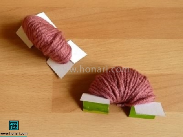 یک نخ بردارید و از لای دو مقوا رد کنید. سپس دو سر نخ را به هم گره بزنید و آن را محکم کنید.