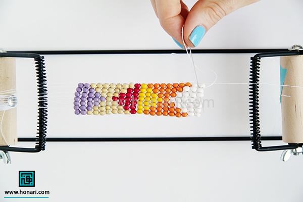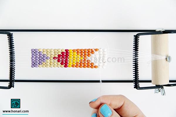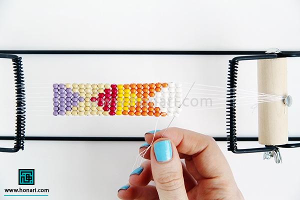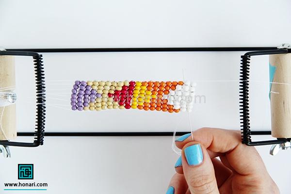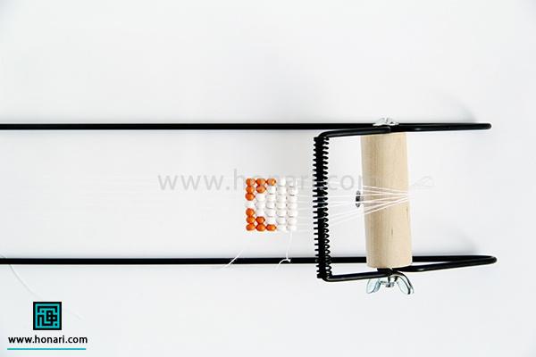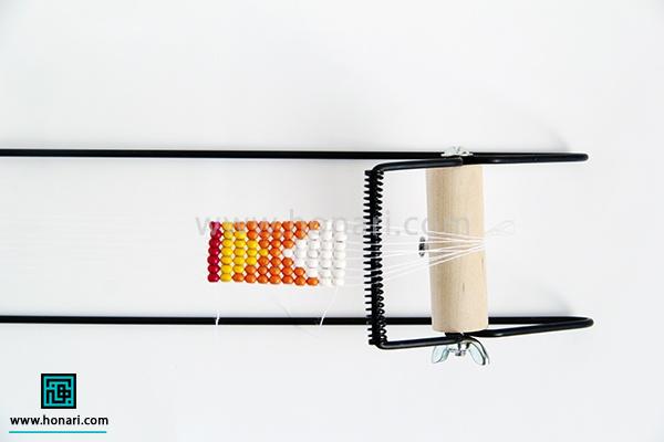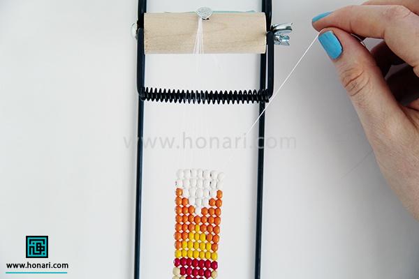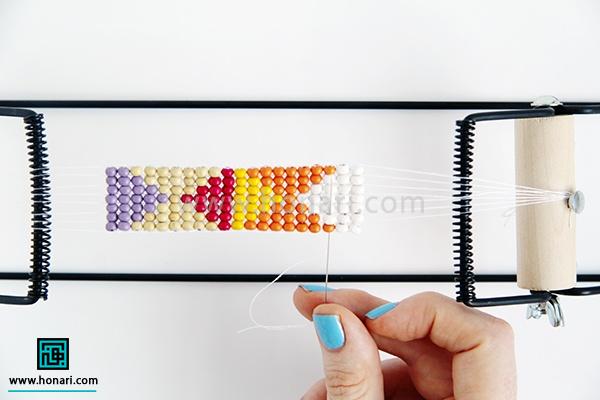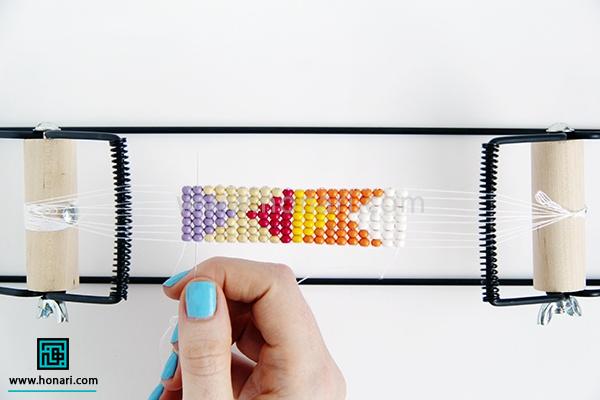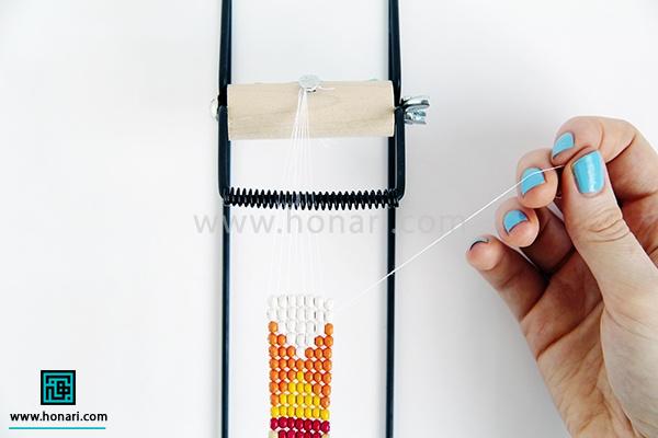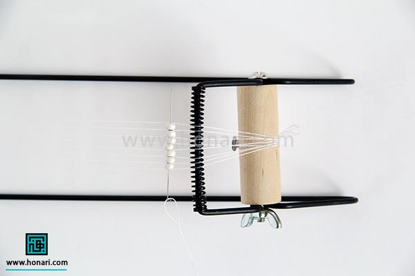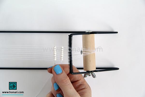 حالا نوبت به ردیف دوم میرسد. مهرهها را داخل سوزن میگذاریم و سپس سوزن را از زیر دستگاه رد میکنیم.