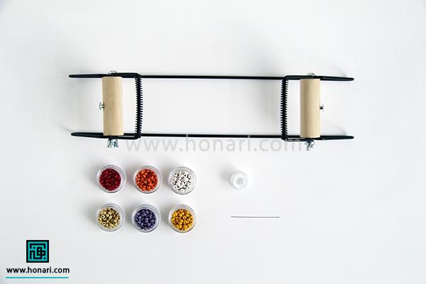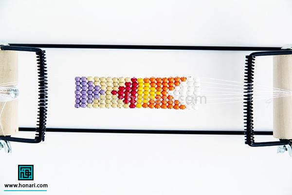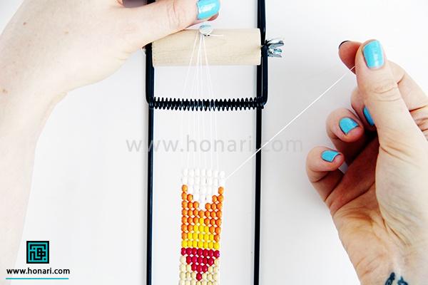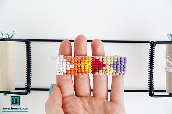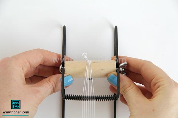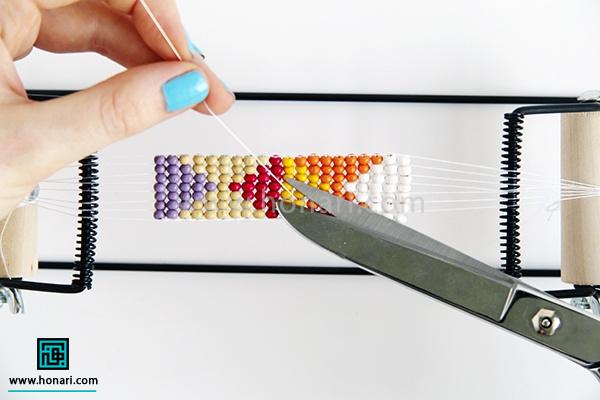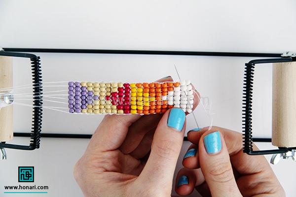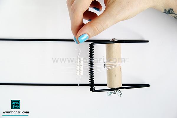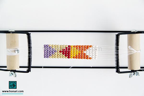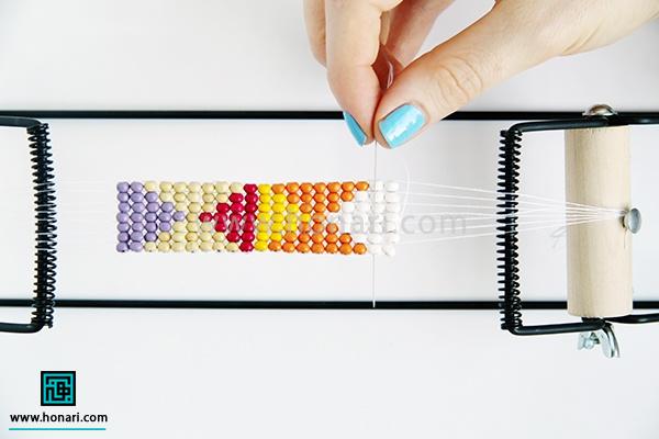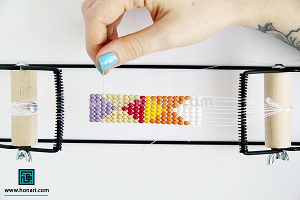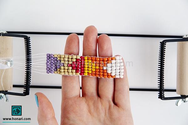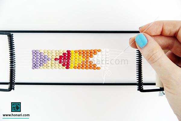 حالا نوبت به ردیف دوم میرسد. مهرهها را داخل سوزن میگذاریم و سپس سوزن را از زیر دستگاه رد میکنیم.
