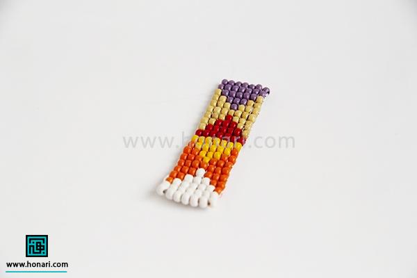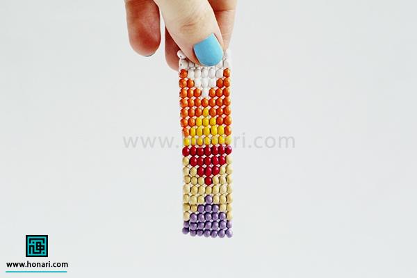 وقتی که به انتهای دستبند میرسیم، دوباره سوزن را برمیداریم و نخ را از میان دانههایی که قبلاً بافتهایم، رد میکنیم.
