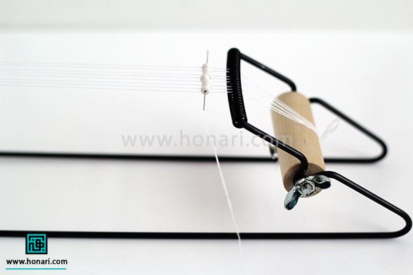 یک سوزن دیگر برمیداریم و آن را با نخ جدیدی آماده میکنیم. سپس سر نخ را به انتهای نخ قبلی که از سمت چپ به دستگاه وصل شده، گره میزنیم.