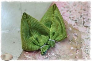 در مرحله دوم، لبههای روبان را از وسط به سمت داخل تا بزنید تا یک شکل مثلثی زیبا ایجاد شود.