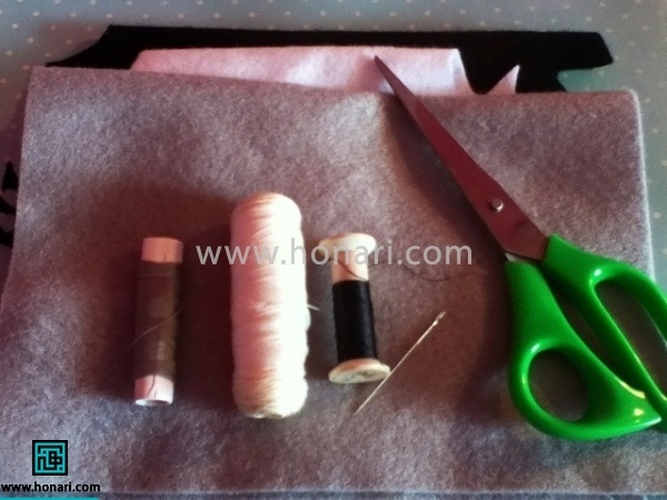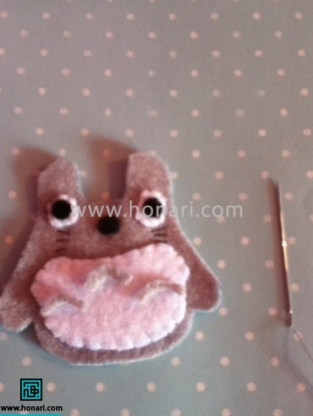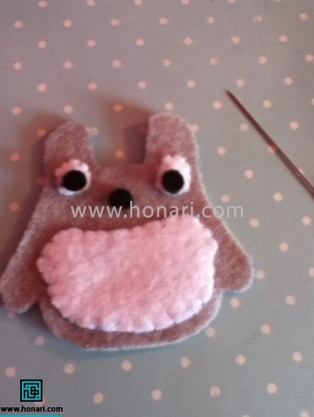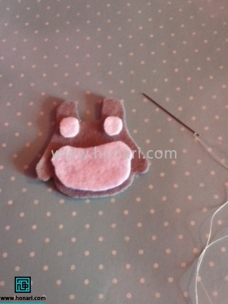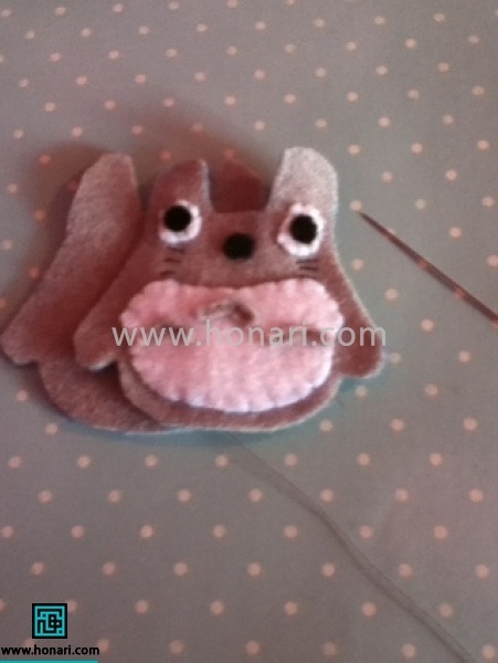 قطعههای مربوط به جلوی عروسک نمدیمان را در جای خود قرار میدهیم و سپس دورتادور آنها را با دقت و یکنواخت میدوزیم.