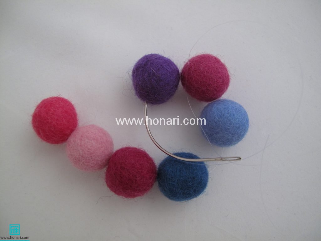 هفت توپ نمدی را به نخ وارد کنید و آنها را به انتهای نخ منتقل کنید تا یک رشته از توپها درست شود. توپها را یکییکی به نخ بکشید. اگر دوست دارید از رنگهای مختلف استفاده کنید، میتوانید به صورت تصادفی رنگها را انتخاب کنید یا از یک الگوی خاص پیروی کنید. من خودم توپهای نمدی را در کیسههای جداگانه بر اساس رنگ قرار میدهم و آنها را با ترتیب مشخصی برمیدارم.