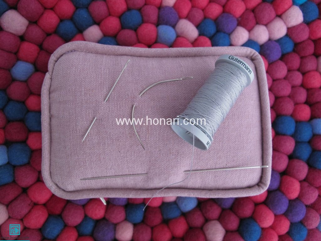 سوزن را نخ کنید و یک گره در انتهای آن بزنید. نخ اضافی را بعد از گره بزنید تا تمیز و مرتب شود.