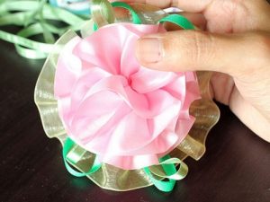 روبان ساتن را مانند مرحله قبل به صورت چین دار جمع کنید، با این تفاوت که طول این روبان باید کوتاهتر باشد. سپس با استفاده از چسب، این دو روبان را به هم بچسبانید.