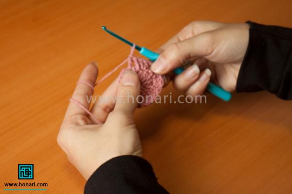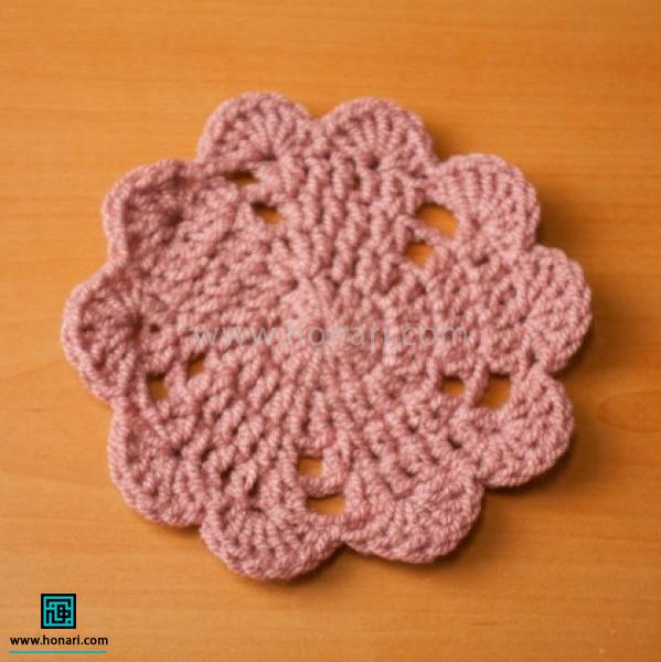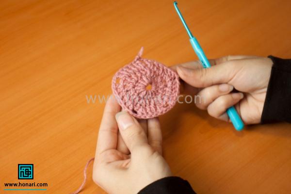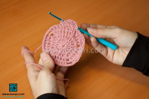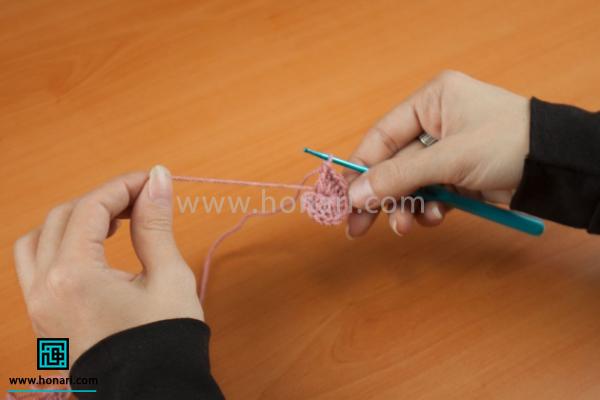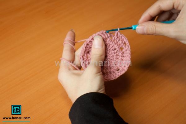 ردیف دوم: دو عدد پایه را داخل یک پایه کار کنید + در پایه بعدی، یک پایه بلند بزنید + دوباره دو عدد پایه را داخل یک پایه کار کنید + یک زنجیره بزنید (این روش را تا انتهای ردیف ادامه دهید).