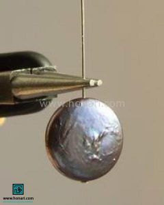 قسمت پایین گوشواره را طبق عکس، از داخل سر سوزن مخصوص عبور داده و سپس آن را داخل حلقه قرار میدهیم.