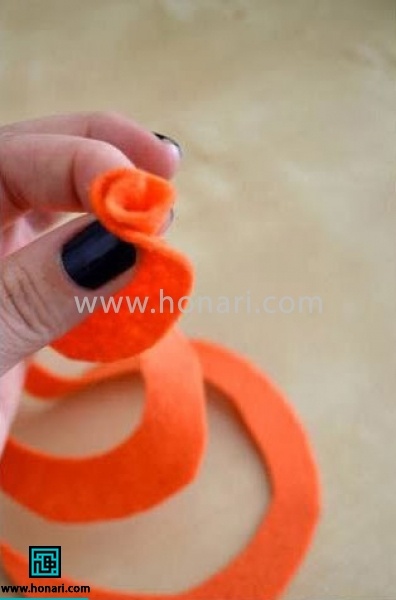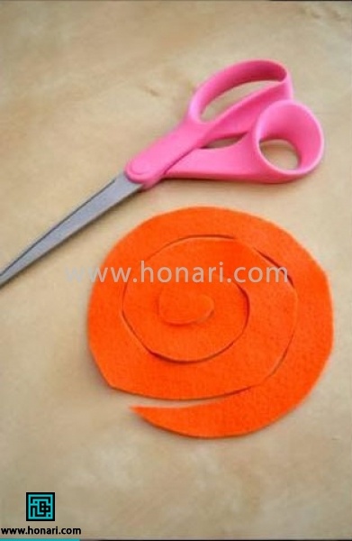 حالا نوبت برش دادن دایره نمدی است. باید آن را به شکل یک مارپیچ یا حلقههای دورانی از لبه به سمت مرکز، قیچی کنید.