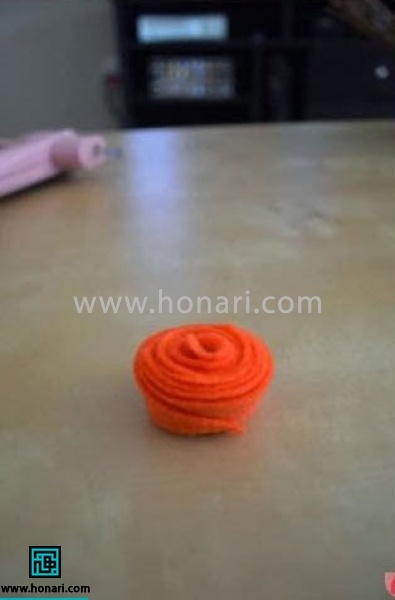 کار را از وسط دایره آغاز کنید و گلها را به دور آن بپیچید. بعد از هر بار چرخاندن کامل، کمی چسب حرارتی بزنید تا گل کاملاً در جای خود ثابت شود.