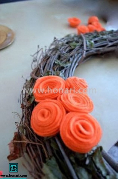 گلهای نمدی را روی حلقههای آماده شده بچسبانید. اگر حلقه آماده ندارید، میتوانید با استفاده از چند شاخه نازک درخت، یک حلقه برای خودتان درست کنید.