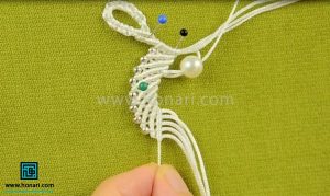 در انتها، مهرهی قفل دستبند را در جای خود قرار داده و سپس سه گره مربعی شکل میزنیم.