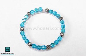 در مرحلهٔ بعد، اندازهٔ دور مچ دست خود را بگیرید. سپس، به همان اندازهای که به دست آوردهاید، مهرههای آبی رنگ ۶ میلیمتری را از داخل یک سیم مفتولی رد کنید. برای اینکه کارتان جلوهٔ زیباتری پیدا کند، بعد از هر سه مهرهٔ کریستالی آبی، یک مهرهٔ تزئینی کوچک (که به آن مهرهٔ بینمهرهای میگویند) قرار دهید.