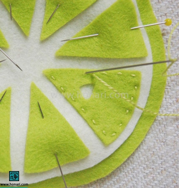 برای نشان دادن قسمتهای پرتقال، چند تا از مثلثهای نمدی را از قسمت بلندشان تا بزنید. سپس با قیچی، برشهای کوچک به شکل مثلث روی آنها ایجاد کنید.
