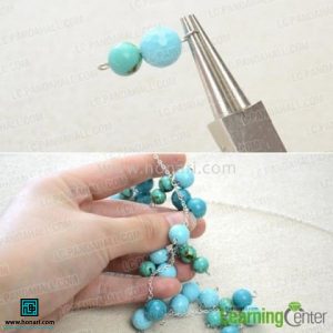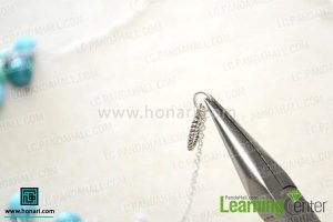در این مرحله، تعدادی از مهرهها را به صورت جفت از داخل سوزن مخصوص عبور میدهیم و در انتهای آنها یک حلقه درست میکنیم. سپس، هر کدام از این حلقهها را به زنجیر کار متصل کرده و با استفاده از انبر، محل اتصال را به خوبی فشرده و محکم میکنیم.