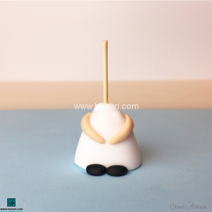 حالا وقت ساختن بدن عروسک است. با خمیر به رنگ پوست، دو قطعه استوانهای هماندازه برای دستهای عروسک درست کنید. سپس دو تکه بیضی شکل از خمیر سیاه برای کفشهای عروسک بسازید و آنها را به قسمت پایین بدن عروسک، که یک مخروط سفید رنگ است، بچسبانید. در پایان یک عدد خلال دندان در آن فرو کنید.