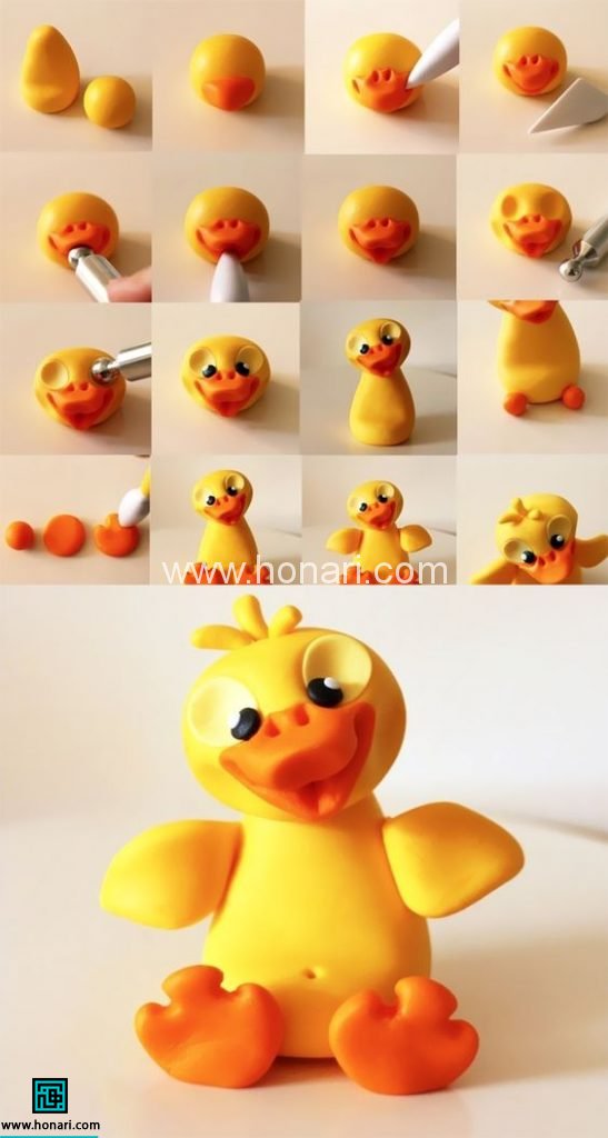 برای درست کردن اردک، خمیر زرد رنگ را مانند شکلی که می‌بینید در آورید.