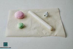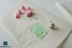 حالا وقت آن است که برگها را درست کنیم. برای این کار، خمیر سبز رنگ را با وردنه پهن و نازک میکنیم. سپس با کمک قالب مخصوص برگ، به تعداد گُلهایی که ساختهایم، برگ برش میزنیم.