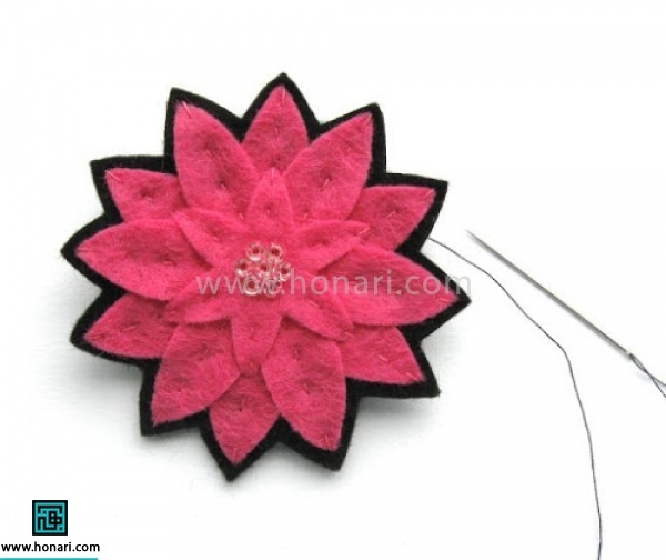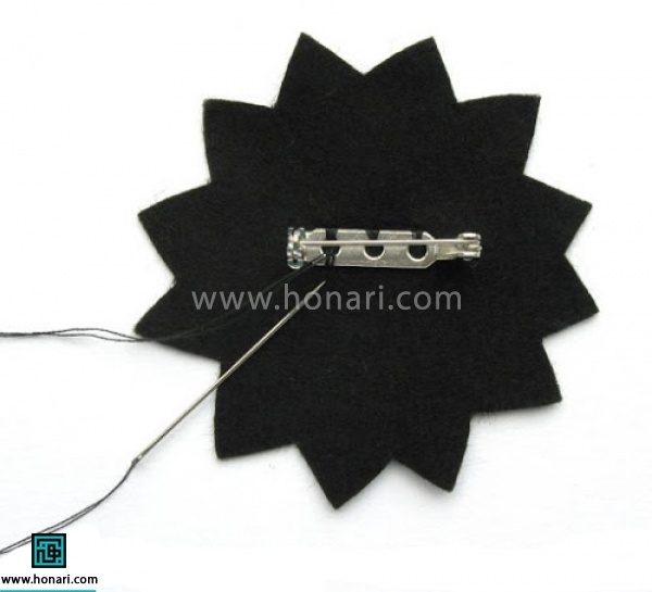 سنجاق سینه را از قسمت پشت و دقیقاً در مرکز گل قرار داده و میدوزیم.