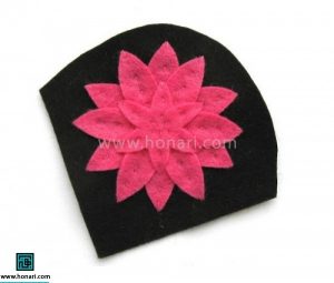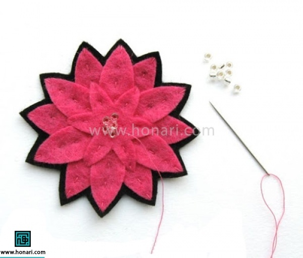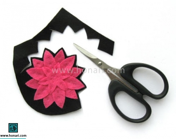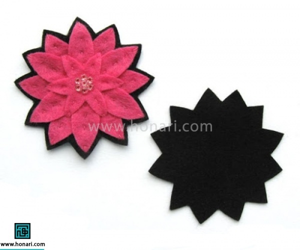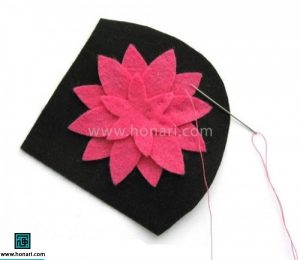 ابتدا با کمک الگو، یک گل کوچک و دو گل بزرگ را برش میدهیم. سپس گلبرگها را طبق تصویر روی هم میچینیم و آنها را روی نمد مشکی قرار داده و با کوک محکم میکنیم.