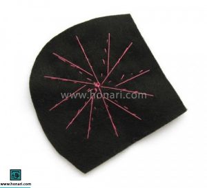 از وسط گل به سمت لبه گلبرگ، با دوخت بخیه روی یک خط مستقیم کار میکنیم. سعی کنید بخیهها منظم و اندازههای یکسانی داشته باشند. در انتها، برای محکمکاری، یک کوک از نقطه شروع تا پایان کار میزنیم.