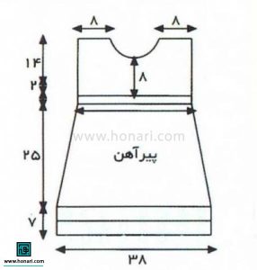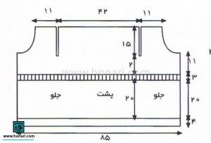**قسمت پشت پیراهن** را دقیقاً مانند قسمت جلو ببافید، با این تفاوت که یقه ندارد.