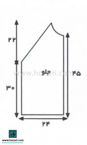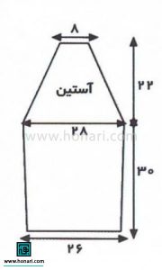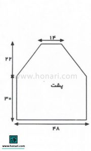 **آستین:** ابتدا ۴۶ دانه سر میاندازیم. طبق نقشه شروع به بافتن میکنیم و از هر دو طرف، در هر رج، یک دانه اضافه میکنیم تا تعداد دانهها به ۵۴ برسد. وقتی قد کار به ۳۰ سانتیمتر رسید، برای قسمت رگلان آستین، ابتدا ۲ دانه را میبندیم. سپس در هر رج رفت، از هر دو طرف یک دانه کم میکنیم. در پایان، ۱۲ دانه باقیمانده را یکجا میبندیم. بعد از این، قسمت جلو، پشت و هر دو آستین را به هم وصل میدوزیم. از یقه، ۷۴ دانه برمیداریم و ۱۰ سانتیمتر با روش دو تا رو، دو تا زیر (کشباف) میبافیم. در پایان، همه دانهها را با هم میبندیم.