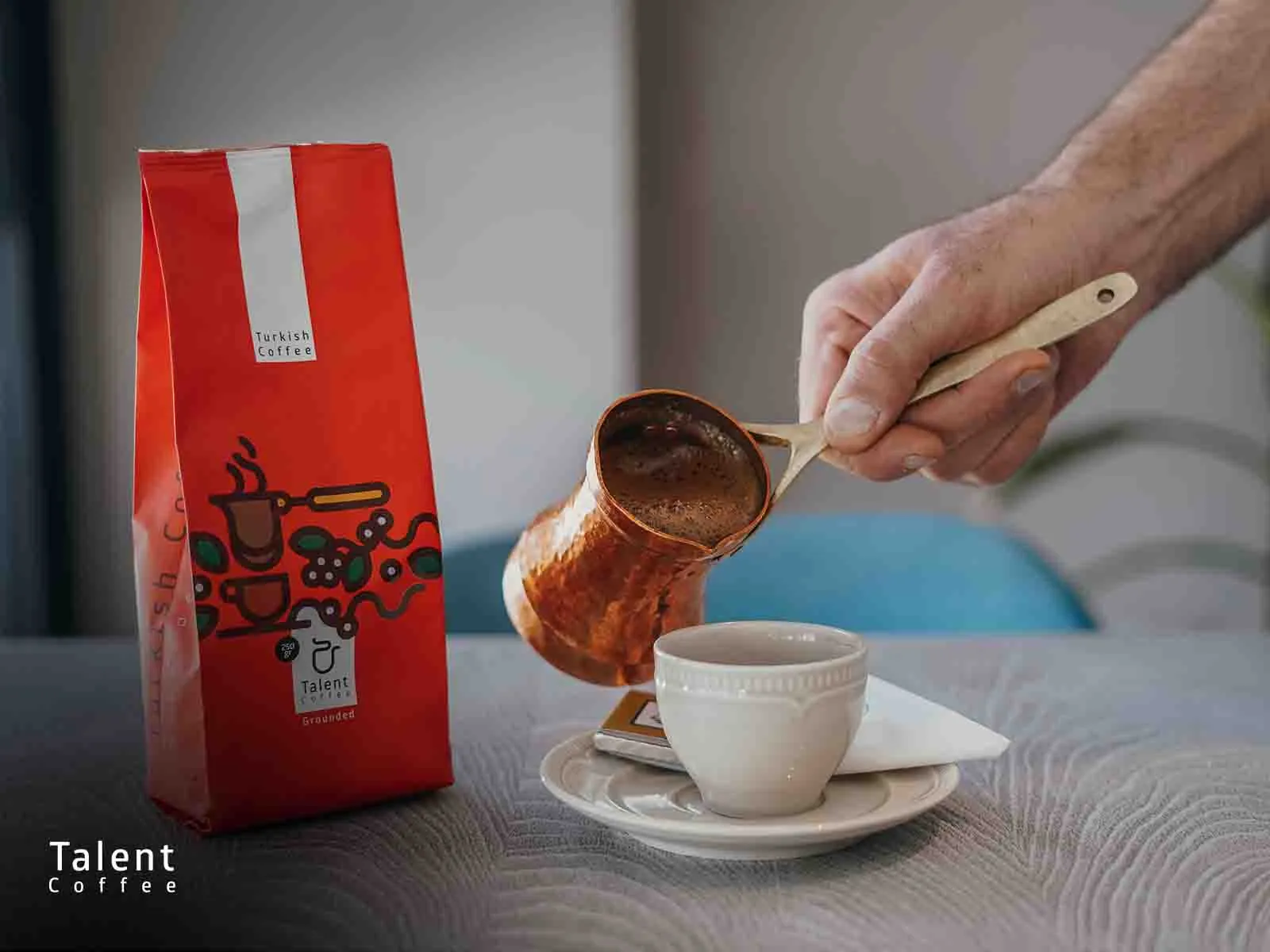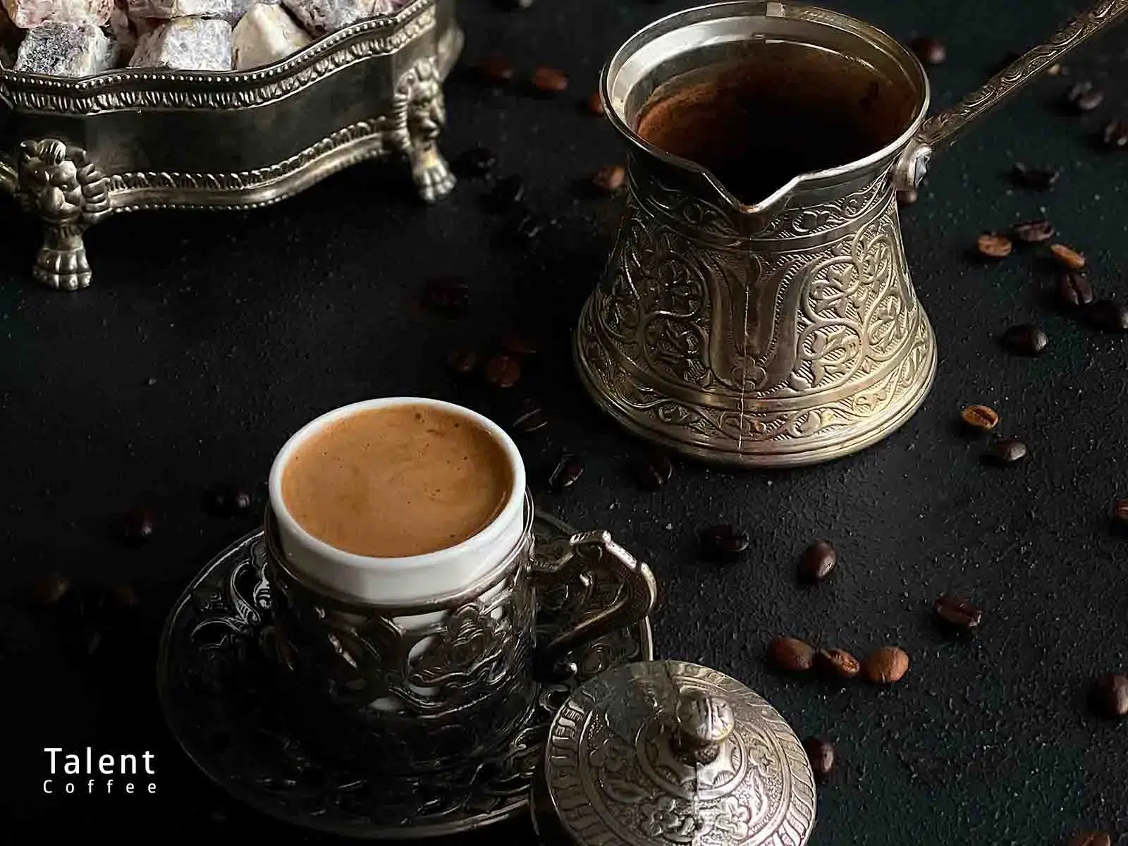 قهوه را همراه با شیرینی یا شکلات نوش جان کنید. چون قهوه ترک معمولاً ته‌نشین دارد، بهتر است قبل از نوشیدن کمی صبر کنید تا این مواد در ته فنجان بنشینند.