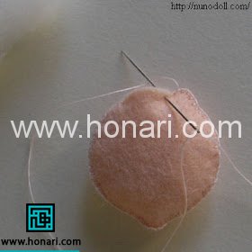 در مرحله دوم، ابتدا دو قطعه دایره‌ای که برای سر عروسک در نظر گرفته‌اید را از لبه‌ها به هم بدوزید. همانند مراحل قبلی، قسمتی از آن را نبندید و باز بگذارید تا بتوانید پنبه یا مواد پرکننده را از داخل آن قرار دهید. پس از پر کردن سر عروسک، قسمت باز را نیز کاملاً بدوزید. در پایان، با کمک نخ و سوزن، چشم‌ها و دهان عروسک را روی سر آن بدوزید.