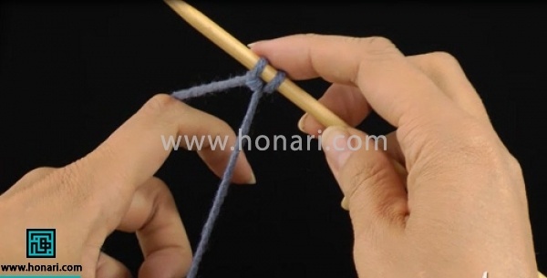 ابتدا یک گره با کاموا بزنید و آن را روی میل قرار دهید.