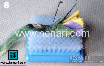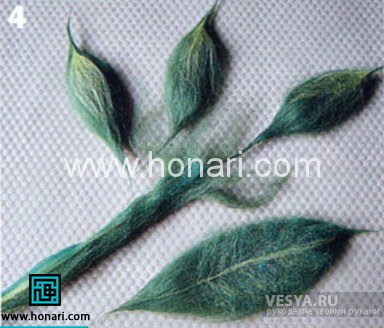 با کمک نخهای سبز، برگها را به شکلی که در تصویر میبینید بسازید. برای این کار، دو سر هر تکه نخ را نازک کنید.