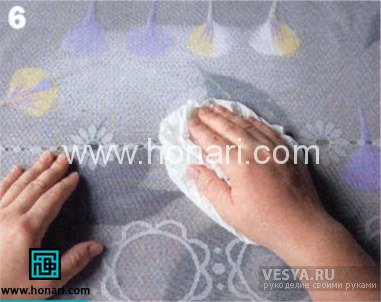 قطعههای آماده شده را میان دو تکه پارچه نازک قرار بده. سپس یک دستمال خیس شده با آب و کف صابون را روی آن بکش تا کاملاً فشرده شوند. توجه کن که پارچهها نباید ضد آب باشند، چون باید آب به راحتی از آنها عبور کند و به الیاف داخل برسد.
