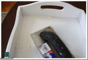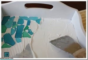ابتدا تمام سطح کف سینی را با چسب چوب می‌پوشانیم.