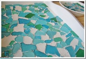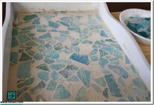 کاشی‌ها را به هر شکلی که دوست دارید، در کف سینی بچسبانید.