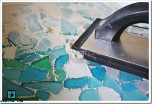 با کاردک، دوغاب را روی کاشی می‌کشیم تا فاصله‌های خالی بین کاشی‌ها به طور کامل و یکنواخت پر شود.