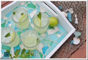یک سینی چوبی، کاشی کریستالی، یک کاردک، پودر درزگیر و چسب چوب.