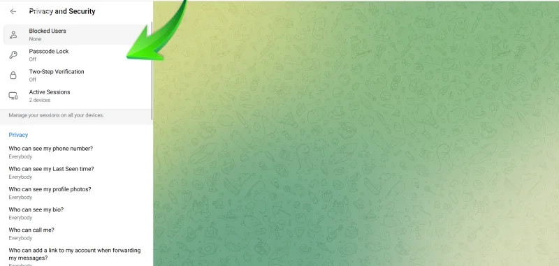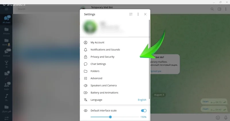 برای این کار، اول برنامه تلگرام را باز کنید و به قسمت «تنظیمات» بروید. سپس گزینه‌ی «Privacy and Security» را انتخاب کنید.