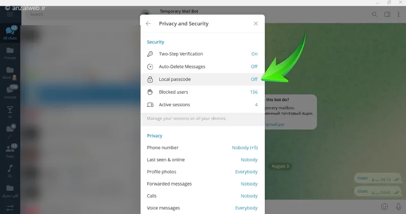 ۳- پسورد گذاشتن روی تلگرام آیفون و اندروید
