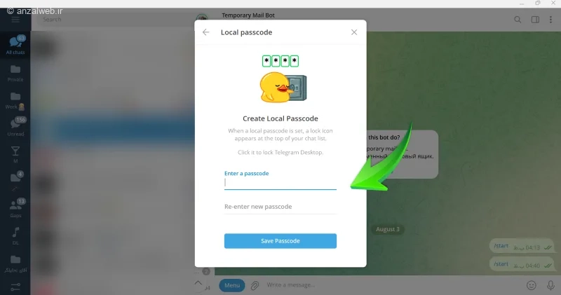 برای جلوگیری از این اتفاق، بهتر است قفل رمز (Passcode Lock) را در تلگرام فعال کنید. این امکان در همه نسخه‌های تلگرام موجود است. وقتی این گزینه را روشن کنید، هر بار که می‌خواهید وارد برنامه شوید، باید رمز عبوری را که انتخاب کرده‌اید وارد کنید. تنها پس از وارد کردن صحیح رمز است که می‌توانید چت‌های خود را ببینید.
