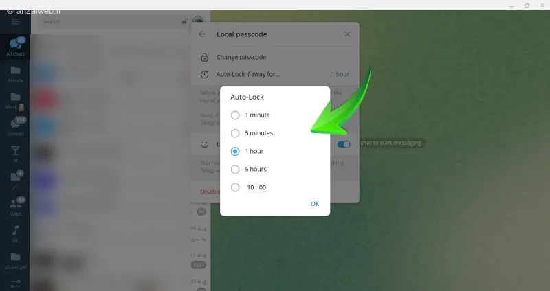 می‌توانید مشخص کنید که تلگرام پس از چه مدت بی‌استفاده ماندن، به طور خودکار قفل شود. برای تنظیم این زمان، ابتدا وارد بخش تنظیمات برنامه شوید. سپس گزینه «Privacy and Security» را انتخاب کنید. در صفحه بعد، روی «Passcode Lock» کلیک کنید. پس از وارد کردن رمز عبور خود، گزینه «Auto Lock if away for» را لمس کرده و زمان مورد نظر خود را تعیین کنید.