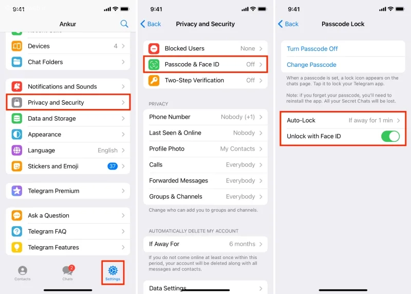 بعد از باز کردن برنامه تلگرام، به بخش Settings بروید. از میان گزینه‌های موجود، Privacy and Security را انتخاب کنید. سپس روی گزینه Passcode & Face ID کلیک کنید و رمز دلخواه خود را تنظیم نمایید. اگر تمایل دارید تلگرام با قابلیت Face ID باز شود، می‌توانید گزینه Unlock with Face ID را فعال کنید.