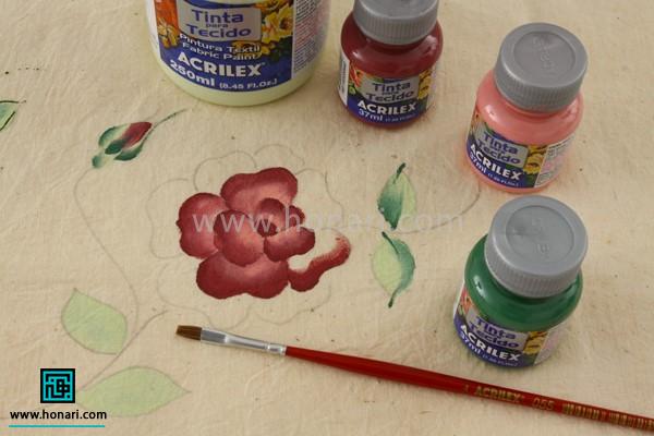 در مرحله بعدی از نقاشی روی پارچه، با استفاده از رنگ عاجی به آرامی و با دقت خطوط مربوط به گلبرگ‌های گل را رنگ‌آمیزی می‌کنیم.