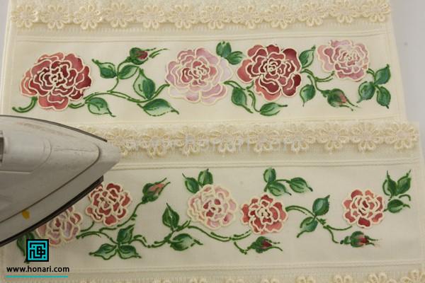 برای شروع، نقشه کار را روی یک کاغذ نازک مخصوص طراحی می‌کشیم. سپس با یک مداد و کاغذ کاربن، طرح گل را با دقت روی پارچه کپی می‌کنیم.